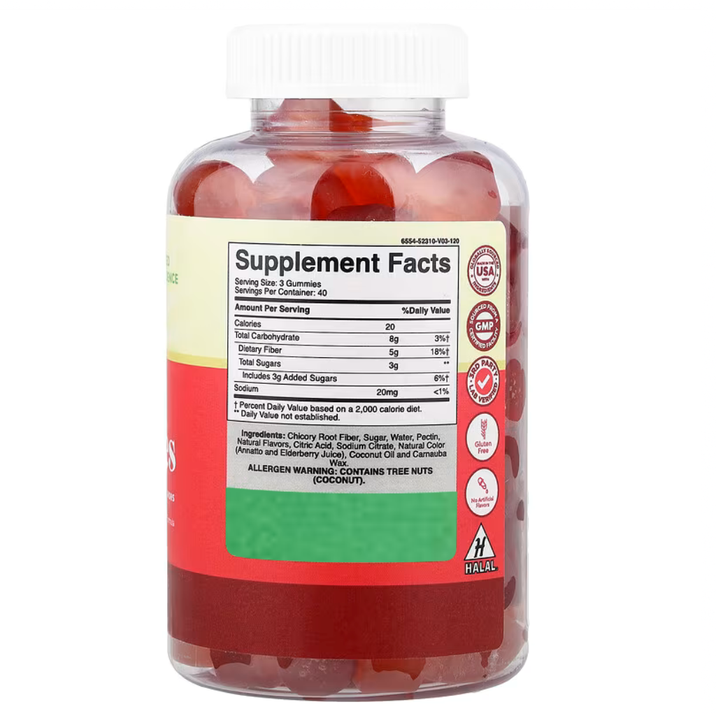 Chicory root fiber, sugar, water, pectin, natural flavors, citric acid, sodium citrate, natural color (annatto and elderberry juice), coconut oil and carnauba wax.
